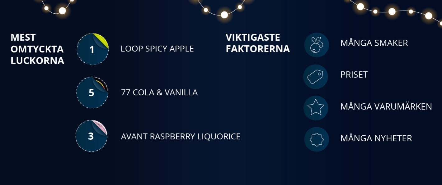 - På frågan om vilken dosa/lucka som var kundernas favorit blev det som nämnt LOOP Spicy Apple som tog hem förstaplatsen i stor stil, följt av 77 Cola & Vanilla på andra plats samt Avant Raspberry Liquorice på tredje plats.